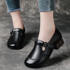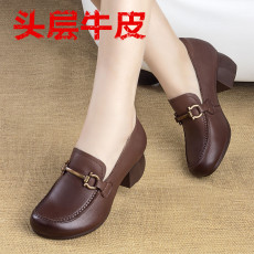 2023春秋新款粗跟单鞋女头层牛皮软底舒适一脚蹬小皮鞋中跟妈妈鞋