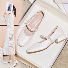 中国风法式手工轻奢压花丝绸中跟鞋女拼色方头一字带粗跟百搭单鞋