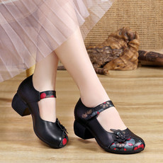 单鞋女粗跟2025春秋新款民族风妈妈鞋真皮中跟软底舒适中老年皮鞋