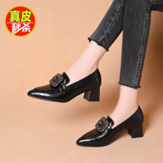 2025春秋新款尖头浅口中跟小皮鞋女鞋百搭粗跟单鞋工作鞋瓢鞋大码