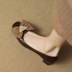 木林森女鞋2024秋季新款真皮妈妈鞋女粗跟通勤蝴蝶结中跟浅口单鞋