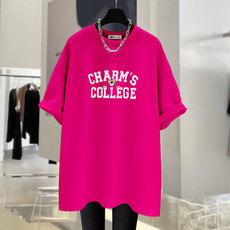 粉色字母短袖T恤女2025春夏印花宽松纯棉中长款遮屁股下衣失踪潮