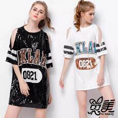泰国潮牌字母数字亮片夏装露肩宽松休闲短袖连衣裙T恤女中长款