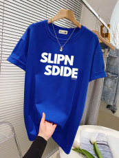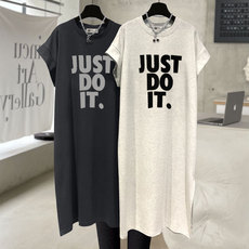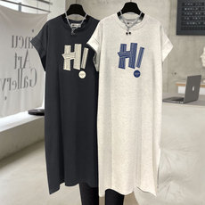 休闲短袖t恤女中长款2025新款夏季韩版字母潮牌开叉宽松连衣裙子