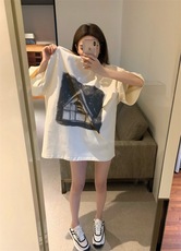 短袖t恤女中长款2025年新款夏季美式墨镜女孩字母潮牌宽松连衣裙
