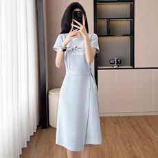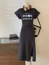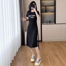 小个子连衣裙女2025夏收腰中长款过膝开叉美式简约字母短袖T恤裙