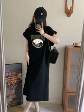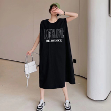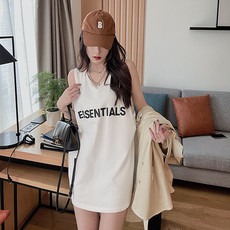 韩系休闲简约开叉字母印花无袖T恤长裙中长款过膝连衣裙女生洋气