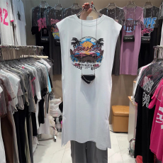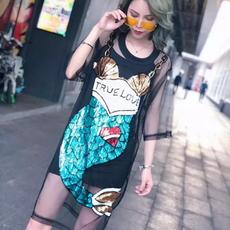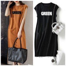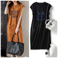 夏季新款短袖女装流行宽松显瘦字母无袖T恤连衣裙中长口袋仙女裙