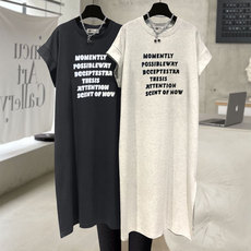 休闲短袖t恤女中长款2025新款夏季个性简约字母港风宽松连衣裙子