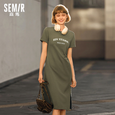 [商场同款]森马连衣裙女复古休闲中长裙2025新款夏字母开叉T恤裙