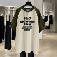 字母撞色拼接圆领短袖T恤女2025春夏印花宽松纯棉中长款遮屁股潮