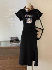 小个子连衣裙女2025夏收腰中长款过膝开叉卡通汽车字母短袖T恤裙