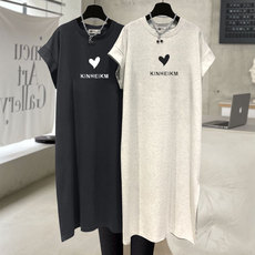 小个子连衣裙女2025夏宽松收腰中长款过膝开叉爱心字母短袖T恤裙