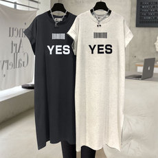 小个子连衣裙女2025夏宽松收腰中长款过膝开叉条码字母短袖T恤裙
