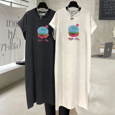 显瘦短袖连衣裙2025年新款夏季美式汉堡字母开叉t恤女裙子中长款