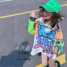 儿童韩版厚棉T2023秋冬新款女孩潮酷街舞上衣机车拼色字母中长T恤