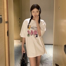 短袖t恤女中长款2025新款夏季韩版卡通洋气女孩字母宽松连衣裙子