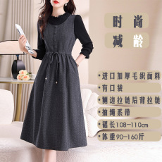 秋冬打底裙娃娃领大码长袖毛呢上衣秋冬季连衣裙中长款胖裙子 A字