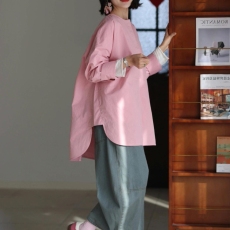 外贸撤回多巴胺粉色圆领宽松燕尾衬衫慵懒风松弛感设计感高级上衣