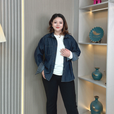 复古蓝色正肩牛仔衬衫女大码春秋高级感显瘦长袖减龄叠穿衬衣外套
