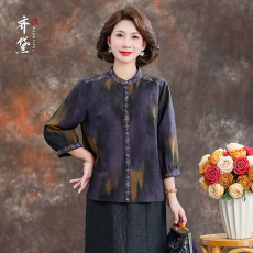 【新中式提花缎面衬衫】蓝若水大码2025秋装新款斜襟珍珠盘扣上衣