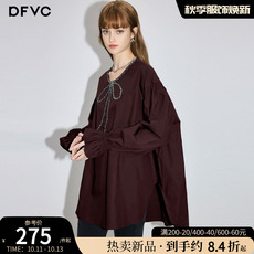 dfvc黑色法式钉珠纯棉长袖衬衫女2025秋季新款圆领宽松中长款上衣