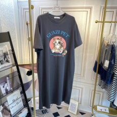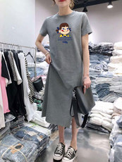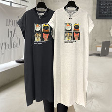 休闲短袖t恤女中长款裙子2025新款夏季韩版卡通猫咪潮宽松连衣裙
