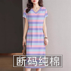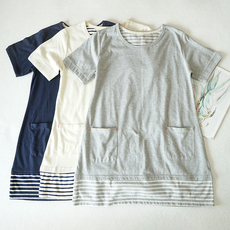 睡裙女士夏纯棉短袖中长款T恤打底衫条纹宽松大码睡衣薄款家居服
