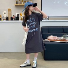 2023夏季新款女童中长款宽松版开叉T恤裙中小童口袋短袖t恤上衣