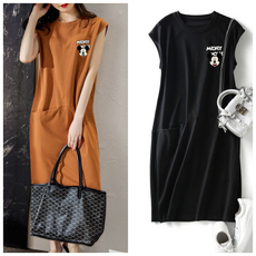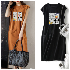 夏季新款短袖女装流行宽松显瘦卡通无袖T恤连衣裙中长口袋仙女裙