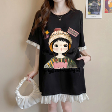 爆款新中式休闲卫衣女短袖夏季新款宽松蕾丝拼接连衣裙中长款t恤