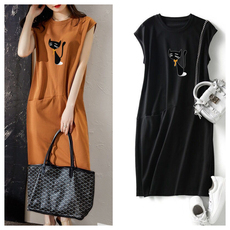 夏季新款短袖女装流行宽松显瘦猫咪无袖T恤连衣裙中长口袋仙女裙