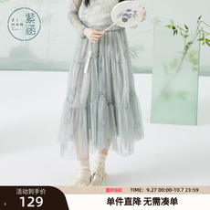 紫涵印花拼接网纱半身裙女春秋季新款松紧带高腰A字型中长款裙子