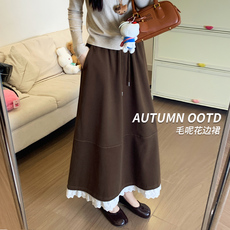 咖色花边毛呢半身裙女春秋2025新款中长款气质秋冬a字高腰伞裙子