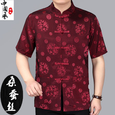 桑蚕丝唐装男中老年真丝绸缎短袖爷爷套装中国风爸爸夏装薄款衣服