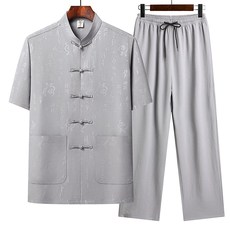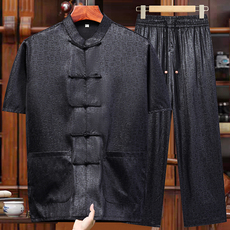 夏季丝质唐装男短袖套装中国风中式盘扣爸爸装中老年人立领太极服