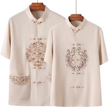 夏季唐装男短袖绣花衬衣 中老年夏装爸爸装薄款冰丝棉麻老人衬衫