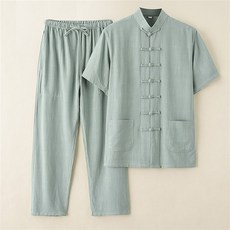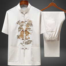 中老年宽松唐装男士短袖中国风亚麻套装汉服太极练功服男