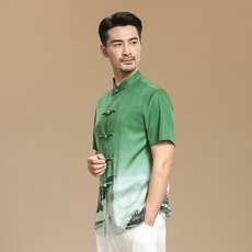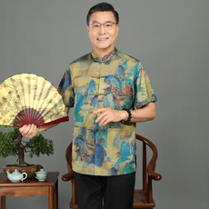 夏季中老年男士中国风山水画休闲时尚百搭薄款宽松加肥唐装短袖衬
