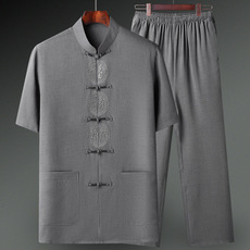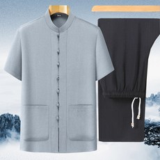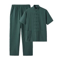 中国风夏季亚麻唐装男短袖套装中式复古男装中老年薄款汉服居士服