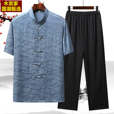 高版中老年人唐装男士中国风夏季薄款冰丝短袖套装爸爸立领衬衫上