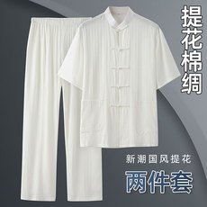 高版新款提花唐装中国风夏季男装套装大码中老年宽松短袖冰丝爸爸