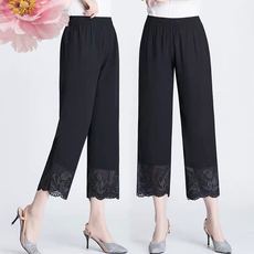 夏季雪纺阔腿裤女拼接蕾丝高腰修身九分裤小个子休闲直筒裤七分裤