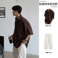 老钱风亚麻短袖衬衫套装男士夏季痞帅轻熟风衬衣穿搭休闲一套衣服
