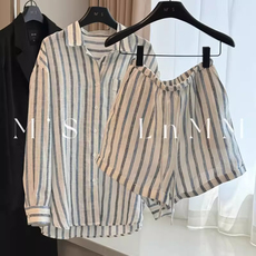 老钱风亚麻衬衫套装女夏慵懒松弛宽松简约高端棉麻衬衫短裤两件套