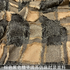 棕色黑色格子流苏仿麻时装面料方块外套半身裙亚麻设计师布料春夏