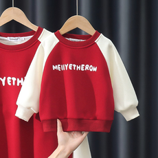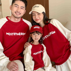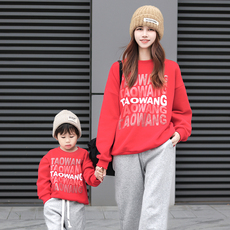 ins风新年亲子装一家三口红色喜庆婴儿母子母女秋冬加绒卫衣套装