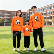 可爱熊猫印花卫衣一家三口四口亲子装秋冬加绒儿童桔色套装母子