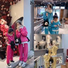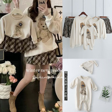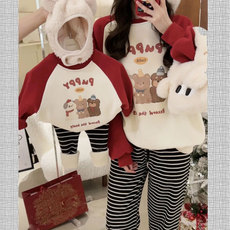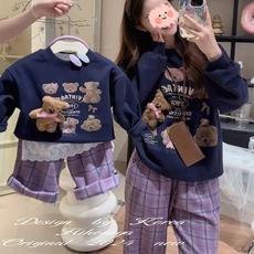 炸街亲子装母女装卡通加绒小熊卫衣格子裤阔腿裤两件套母子套装潮