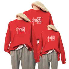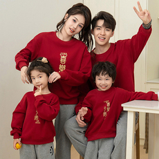 新年亲子装一家三口刺绣爱心卫衣加绒红色喜庆全家装套装母子装